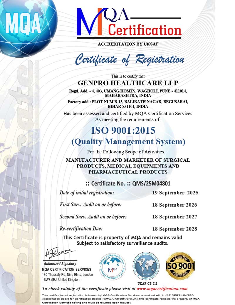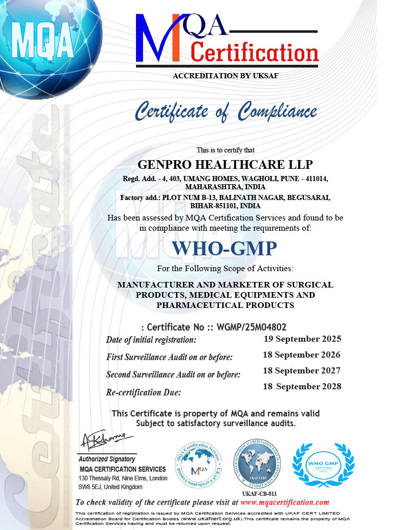 Genpro Healthcare LLP upholds the highest standards of quality and compliance, reflected in its certifications and accreditations. Each process, from sourcing to production, meets stringent regulatory benchmarks, ensuring safety, reliability, and consistency. These recognitions reinforce our commitment to excellence, earning the trust of healthcare professionals and partners who rely on our products for uncompromised performance every day.